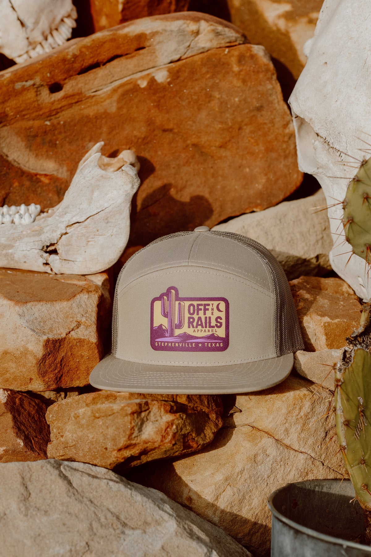 The Desert Sundown Patch Hat features a clean desert landscape patch with cactus and moon details, stitched on a khaki Richardson 168 7-panel cap. The loden mesh back offers breathability, while the structured front keeps the fit sharp and durable. Whether you’re on the job, out in the sun, or keeping it casual, this one keeps you covered in all the right ways.