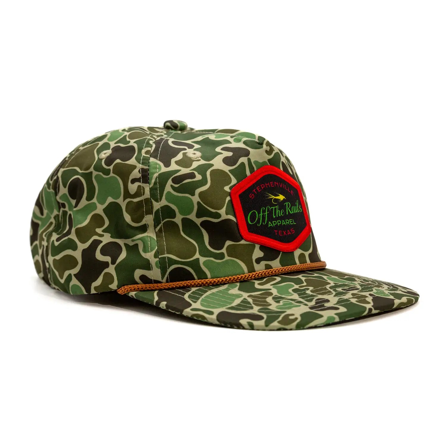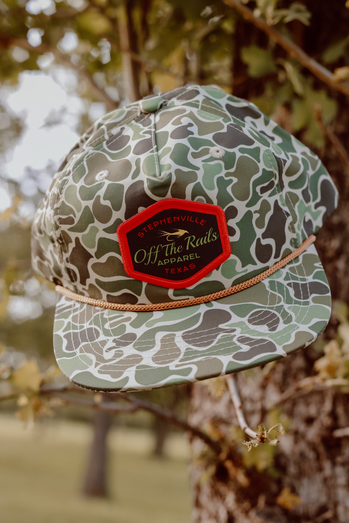 The Fish Hook Patch Hat is built for early casts and long days on the water. Featuring a bold patch on a camo rope hat with copper trim, it’s structured, breathable, and made to hold up wherever the line takes you. Perfect for lake days, campfires, or anything outdoors.