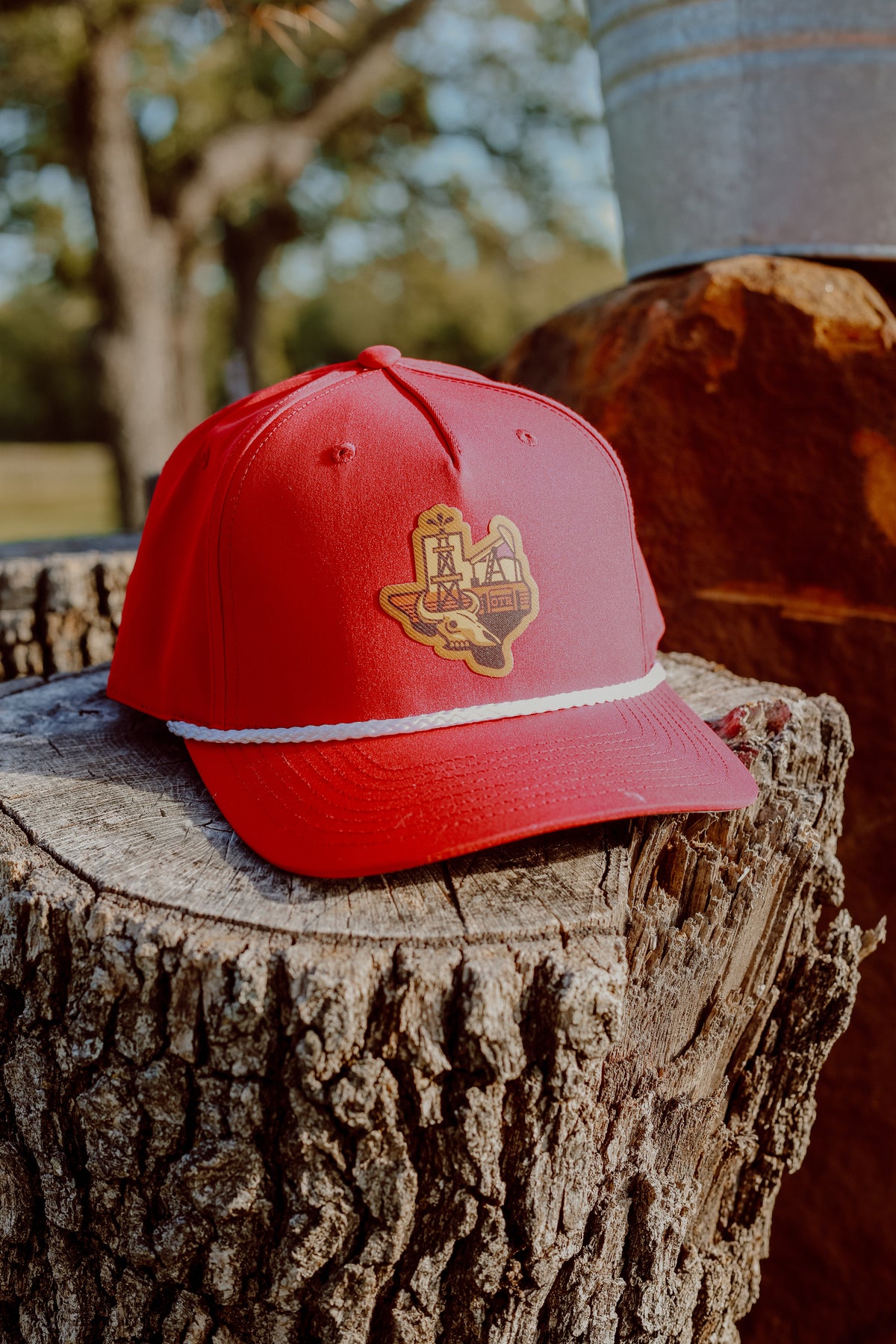 The Texas Oilfield Patch Hat features a bold black-and-gold patch showcasing a classic oil rig and longhorn skull overlayed on a Texas silhouette. Set on a red Richardson 258 rope hat with white trim, this one’s made for the hard-working, no-frills crowd that keeps the state running. Tough, breathable, and built for the field or the weekend.